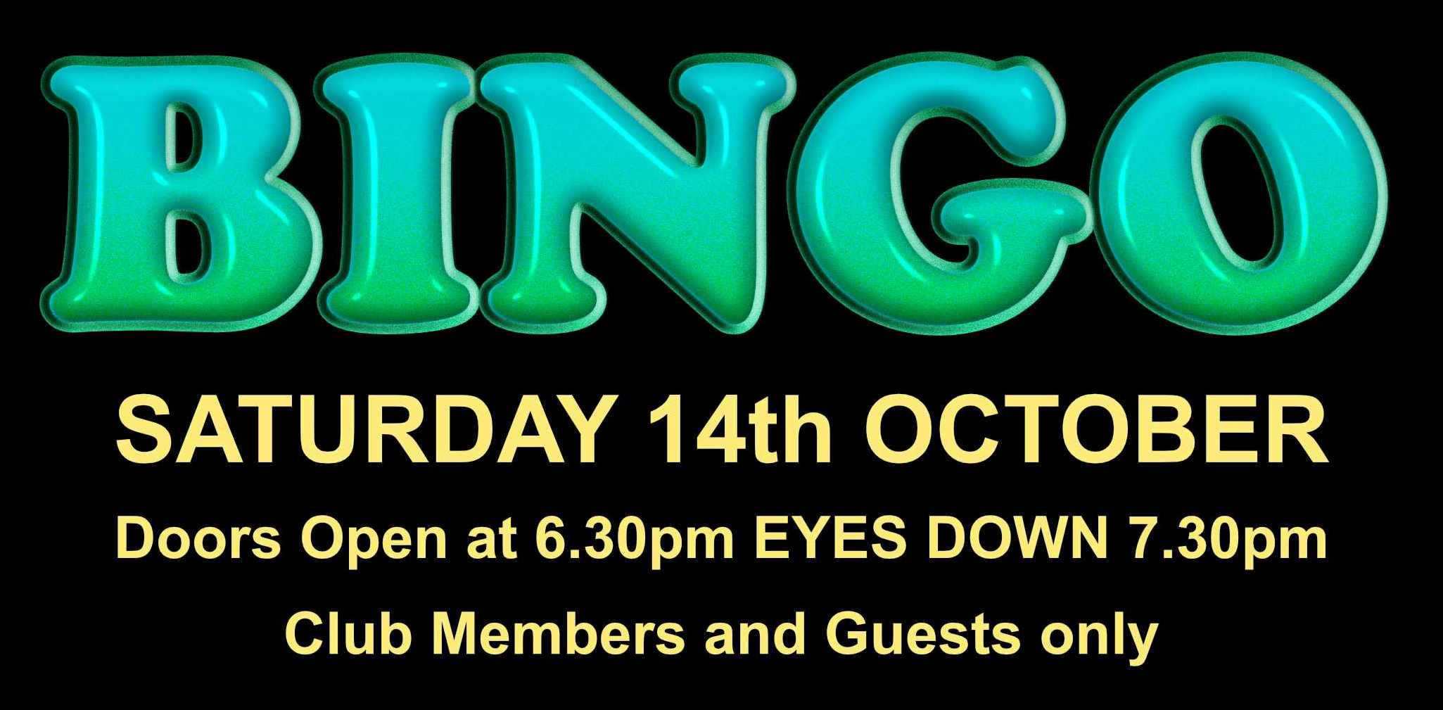 Come to BINGO on Saturday 14th October. Doors open and ticket sales from 6.30pm. EYES DOWN 7.30pm. The Bar will be open and there will be free tea, coffee and biscuits at half time. Please note, this event is open to Club members and their guests only.